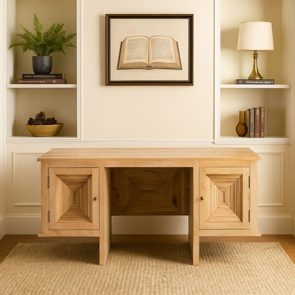 🪑Design & Aesthetic - The desk features a clean, contemporary rectangular desktop supported by two distinctive, floating-style pedestal cabinets. The defining design element is the recessed geometric square pattern carved deeply into the front of each cabinet door, creating a textured, multi-dimensional effect. The overall silhouette is balanced and symmetrical, contributing to a sense of order and calm. The light, natural wood finish highlights the beautiful grain of the mango wood and the depth of the carvings. The piece is accented with small, subtle round metal knobs that complement the warm wood tone.