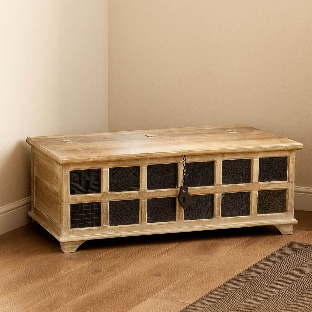 🌿Design - The trunk features a wide, low rectangular silhouette with a hinged, lift-top lid. The design is characterized by its light, whitewash or natural wood finish that highlights the mango wood grain. The focal point is the front apron, which is segmented into rectangular panels, each inset with a dark, patterned metal sheet. This "Print Block" effect provides a striking visual contrast between the light wood and the dark, textured metal. It sits slightly elevated on simple, flared block feet.