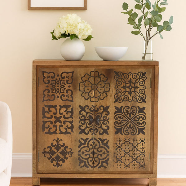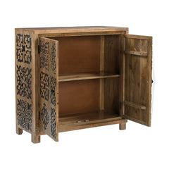 🌿Design - The cabinet features exquisite hand-carved floral and geometric motifs on its doors, adding a touch of traditional charm to its overall look. Its compact yet stylish structure with clean lines makes it suitable for both contemporary and classic interiors. The natural wood finish highlights the rustic beauty of the piece, while the carvings create a distinctive statement that enhances any setting.