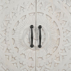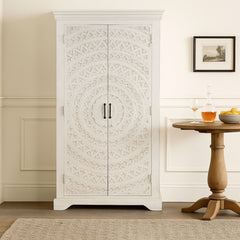 Bring elegance and sophistication to your living space with the Carved Lace Bar Cabinet, exquisitely crafted from solid mango wood. Featuring an intricate hand-carved floral lace design on its doors and a spacious interior with dedicated storage for bottles, glasses, and accessories, this cabinet beautifully blends artistry with functionality. Its antique white finish, sturdy build, and luxurious detailing make it a statement piece for entertaining guests or elevating your home décor.