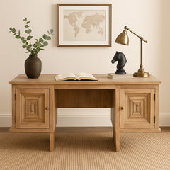 🌳 Material & Wood Quality - The entire desk is constructed from durable Solid Mango Wood, prized for its stability, rich grain variations, and sustainable nature. The distinctive cabinet door fronts are created by deeply carving the geometric pattern directly into the solid wood. The wood is finished with a natural, protective sealant that preserves its light, organic color while safeguarding the surface from daily wear. The cabinet doors are equipped with small, polished metal knobs and reliable hinges.