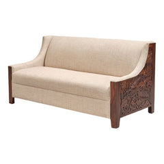 🌿Design The sofa is designed with a modern yet traditional appeal, featuring gracefully curved armrests that add elegance and comfort. Its solid Sheesham wood sides are adorned with intricate floral carvings, giving it an artistic and luxurious character. The neutral beige upholstery ensures that it blends effortlessly with any interior décor, making it suitable for both classic and contemporary spaces.
